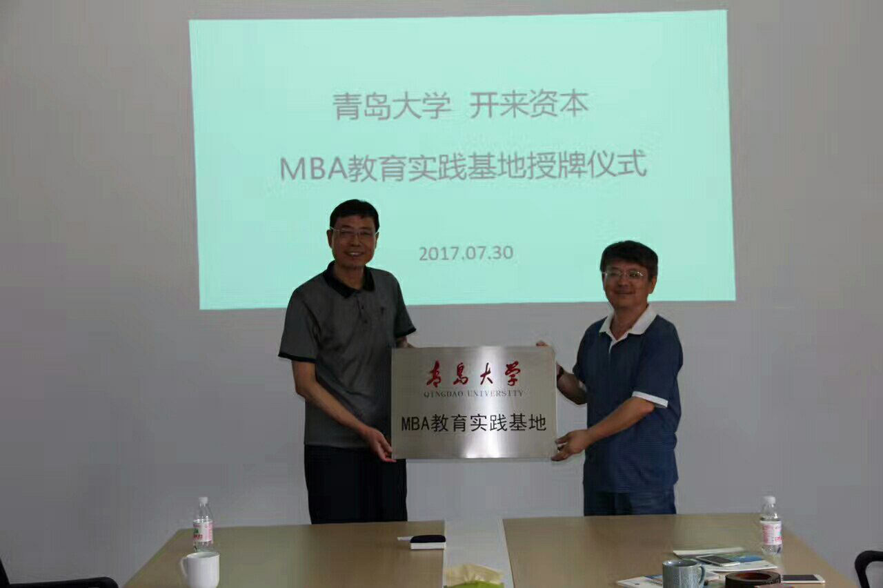 7月30日,青岛大学MBA教育中心与开来资本签约共建“MBA教育实践基地”,签约揭牌仪式在山东开来资本管理股份有限公司(简称开来资本)举行。开来资本董事长王峰、pp电子游戏官网党委书记管永建、pp电子游戏官网MBA教育中心办公室主任刘翠军、pp电子游戏官网青年学者联谊会会长马骋博士及国际商务系李金克教授出席了签约揭牌仪式。
