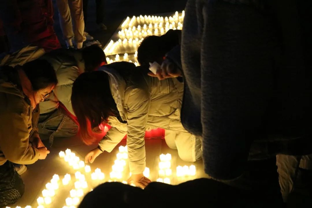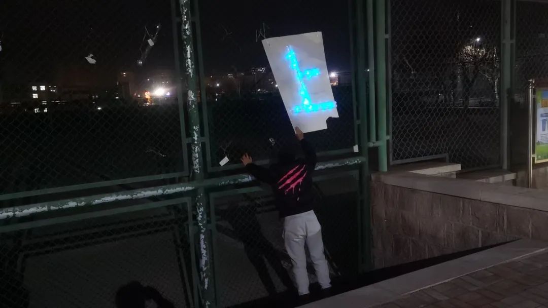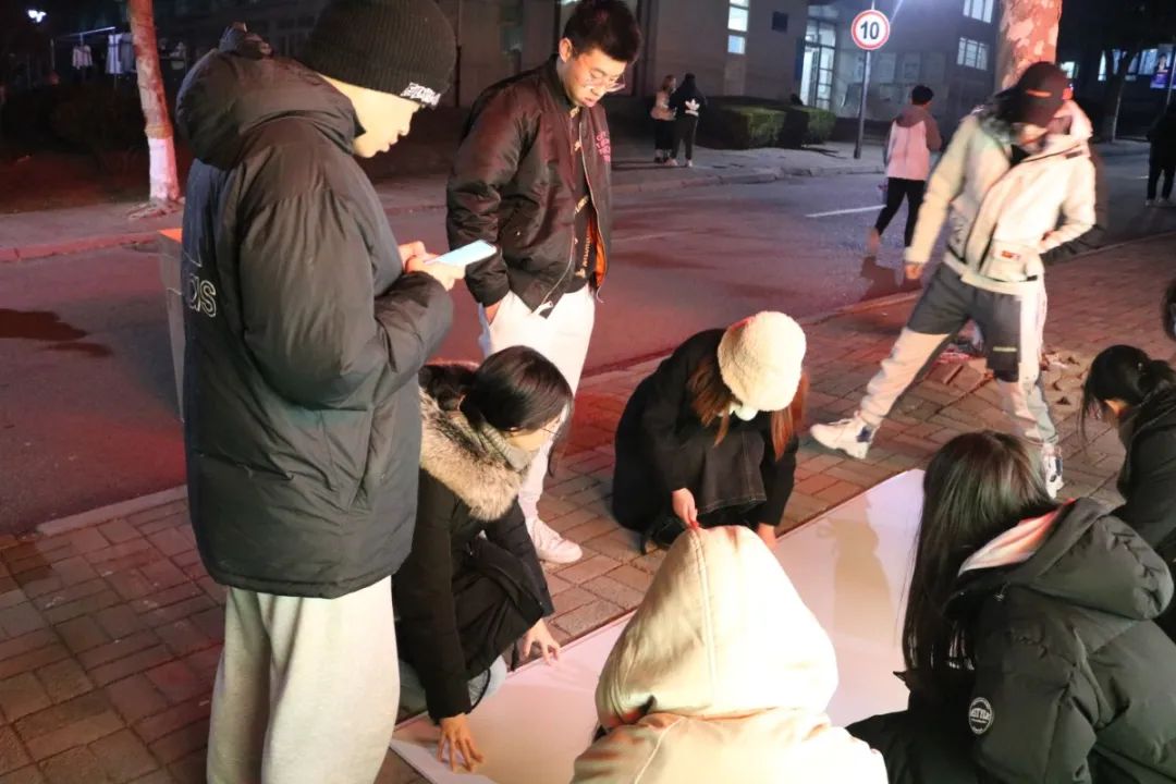 3.晚上九点半到十一点半,学生会成员们分别在图文中心、篮球场和四号楼到六号楼的沿路集合,将事先贴在画稿上的双面胶撕掉,贴上色彩斑斓的荧光棒,在贴荧光棒的过程中,同学们都积极参与,纷纷为鼓励学长学姐考研贡献自己的力量。