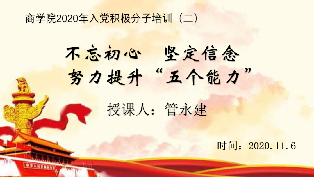 2020年11月6日下午三时,pp电子游戏官网入党积极分子培训班第二讲在pp电子游戏官网金家岭校区图文报告厅开展,pp电子游戏官网党委组织委员管永建授课“不忘初心 坚定信念 努力提升五个能力”。