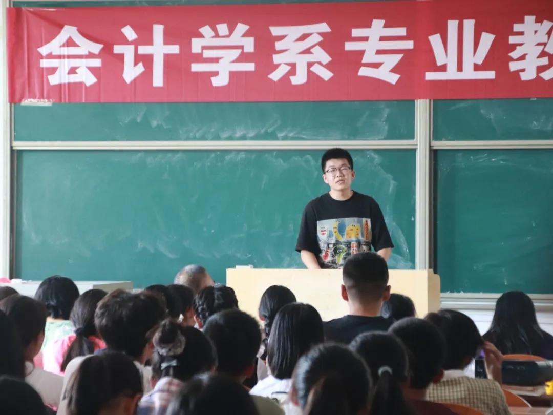 会计学系主任范英杰老师、副主任鲍在山和康进军三位老师介绍了专业设置及培养目标,展示了本专业的师资力量和科研成果,同时也展示了考研率和就业率,鼓励大家积极考研,继续深造。