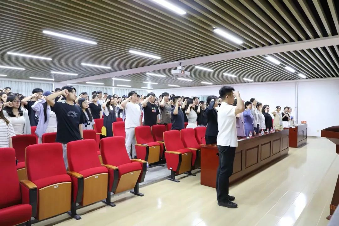 “我志愿加入中国共产党……”全体党员在刘明远同志领誓下面向党旗庄严宣誓,铿锵誓言与窗外蝉鸣交织成青春的交响。廉洁教育的严肃课题、毕业送别的温情时刻、青春奋斗的炽热理想,已在这场主题党日中熔铸成前行的灯塔。