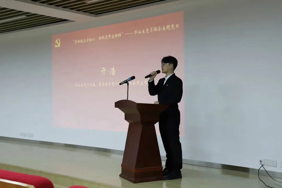 毕业生党员郑田谊、亓浩作为代表分享自己四年来以党旗为引领,在勤学笃行中淬炼初心、于躬身实践中校准航向的体验和经历。从入党宣誓时的青涩面庞到志愿服务中的汗湿衣襟,从深夜自习室的求知目光到学生工作中的挑灯夜战,每一帧都映照着青春与信仰的同频生长。