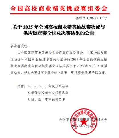 日前,由中国国际贸易促进委员会商业行业委员会、中国仓储与配送协会和中国商业经济学会共同主办的2025年全国高校商业精英挑战赛物流与供应链竞赛全国总决赛圆满落幕pp电子游戏官网选派的牛贵艳、李文婷、杨志举、艾提排·穆合塔尔、陈妍五名学生组成的参赛团队作品《老字号企业供应链数字化转型实践与优化——以青岛食品为例》,从全国291组参赛队伍中脱颖而出,在本次“物流与供应链”竞赛中获得全国总决赛一等奖。
