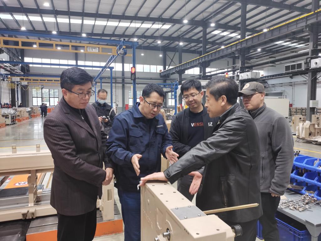 在海佳集团总经理刘井然的陪同下,pp电子游戏官网一行参观了海佳集团临港工业区新厂区。青岛海佳集团公司初创于1995年,专注于无梭织机领域,目前公司实现年产10000台无梭织机生产能力,年产值达到7亿元。临港工业区的新厂区始建于2019年,公司投资3亿元建设纺织机械智能制造工厂,通过开展高端无梭织机数字化和标准化生产流程、数字化生产装备系统、全流程信息化管理系统开展研究,开发出高端无梭织机数字化生产流程、数字化生产装备、质量在线监测系统全流程信息化管理系统,建立起年产一万台高端无梭织机的数字化工厂。