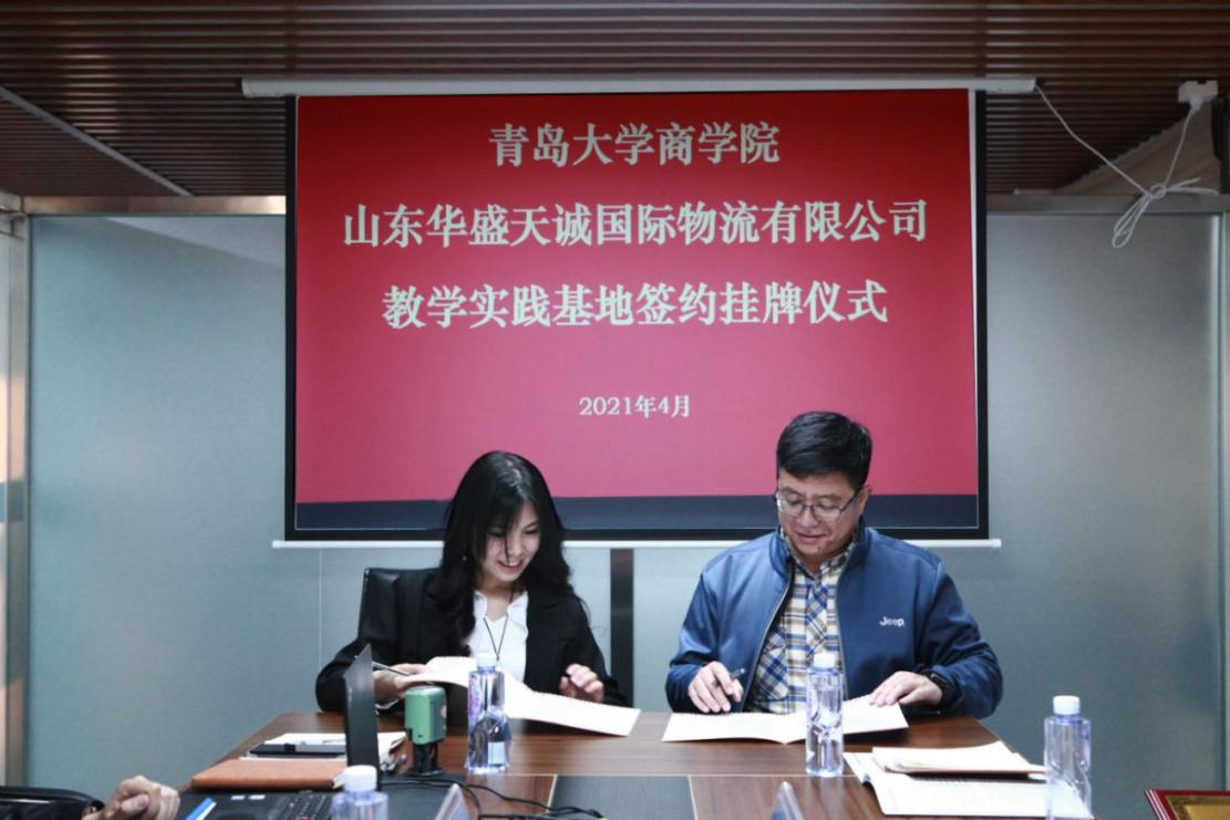 于文和王芳芳共同签署了pp电子游戏官网与山东华盛天诚国际物流有限公司教育实践基地共建协议。王功勇代表pp电子游戏官网和韩波共同为教学实践基地揭牌。