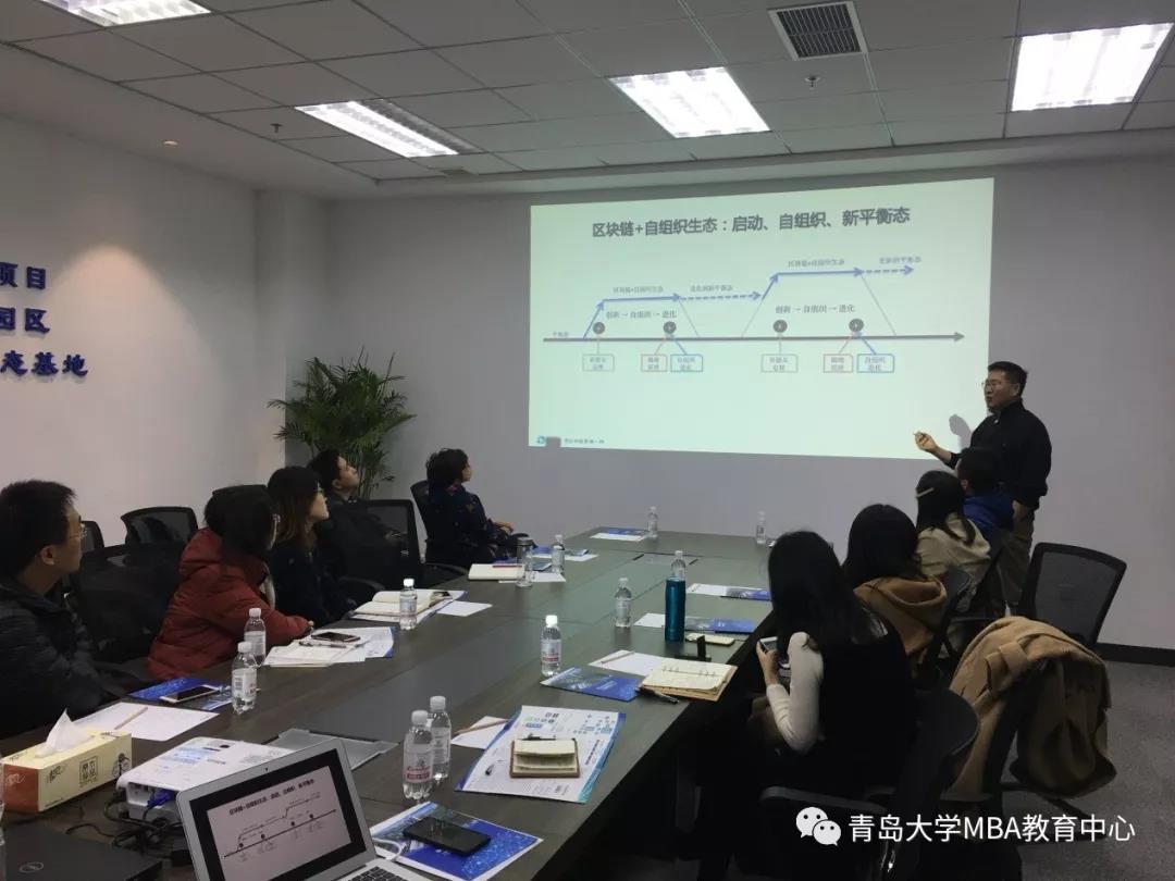 2018年 12月1日上午9:00,2018年 12月1日上午9:00,pp电子游戏官网MBA学员到青岛链湾研究院参观学习。一开始,青岛链湾研究院闫昶德执行院长详细介绍了链湾成立的背景、发展历程和未来方向。他表示,青岛链湾以自我创新为动力,以区块链技术应用服务为导向,以“政府引导、市场推进、企业化运作”为原则,全面建设以“一楼、一中心、一院、五大平台、十大应用场景”为核心的区块链产业生态服务基地——“中国链湾”。