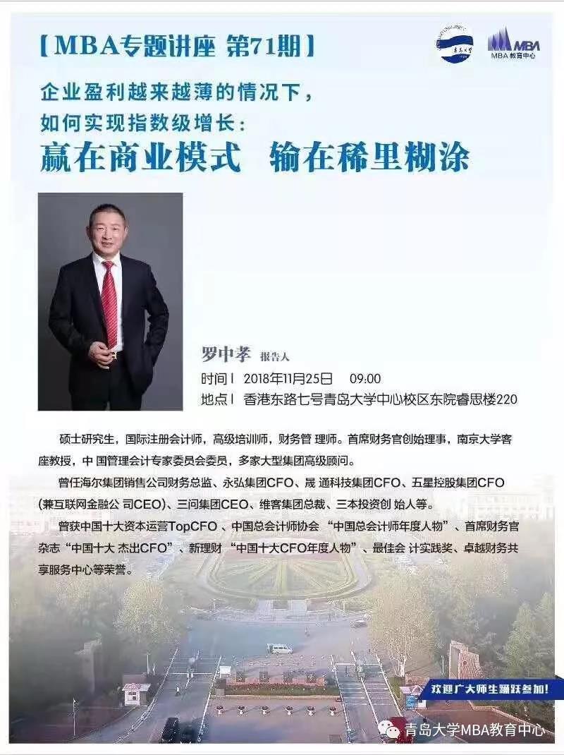 2018年11月25日9:00,在pp电子游戏官网东院睿思楼,pp电子游戏官网MBA校友、现三本投资创始人罗中孝老师为2018级MBA学员讲述了《赢在商业模式 输在稀里糊涂》专题讲座。